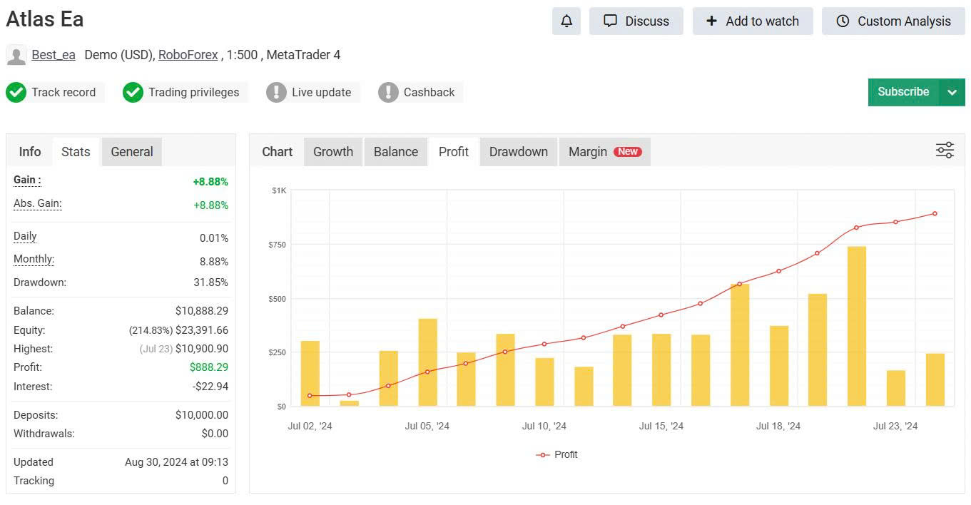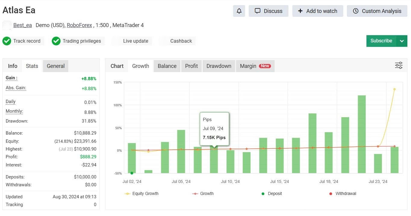 Atlas EA holds an active MyFxBook tracking record with verified track record status and verified trading privileges — both confirmed by green-status checkmarks on the signal page. The account ran from Jul 02 – Aug 30, 2024, logging real-time equity and balance data. The tracking period spans 8 weeks on a demo account, which is shorter than a full multi-cycle verification. Independent live account validation over 90+ days is required before treating demo results as predictive of live performance.