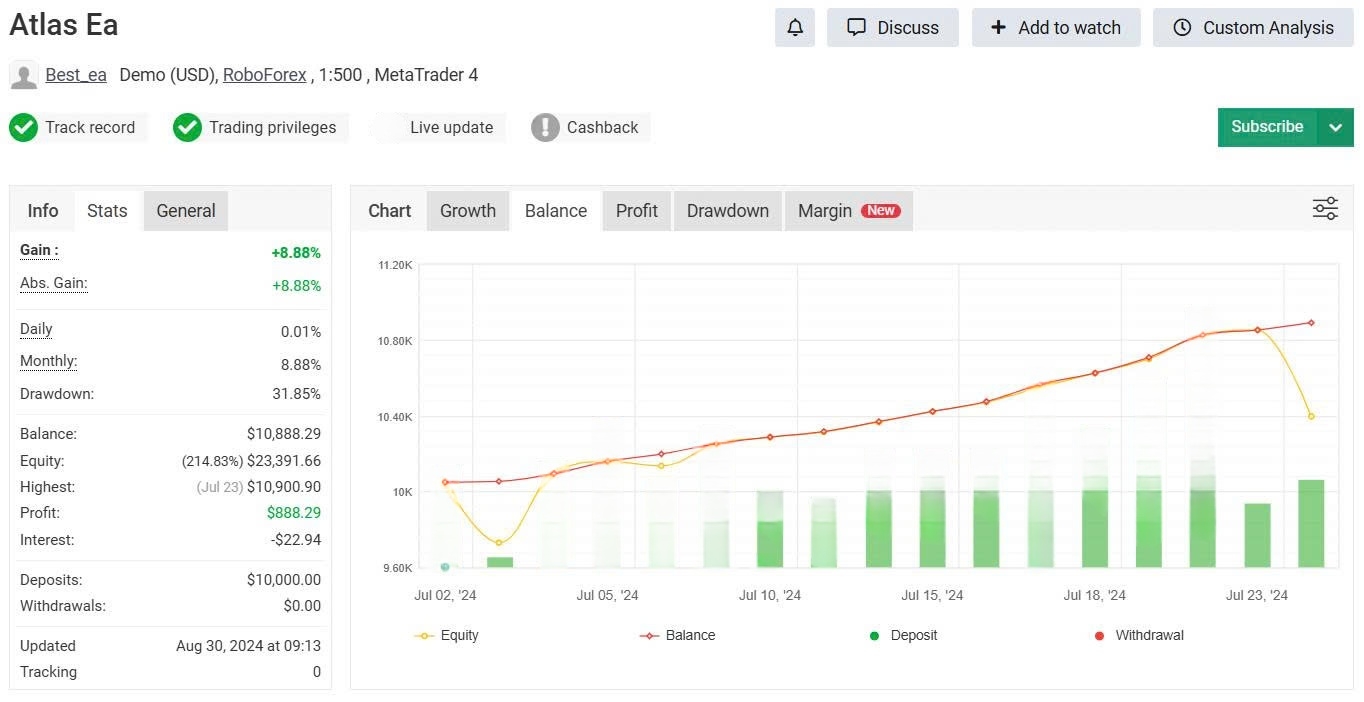 AtlasQuant Forex EA is a demo-account automated forex EA running on MetaTrader 4, with active MyFxBook tracking verified from Jul 02 – Aug 30, 2024. Live tracking records +8.88% total gain and $888.29 net profit from a $10,000 initial deposit over approximately 8 weeks. The account carries a 31.85% peak drawdown requiring careful capital management before deployment.