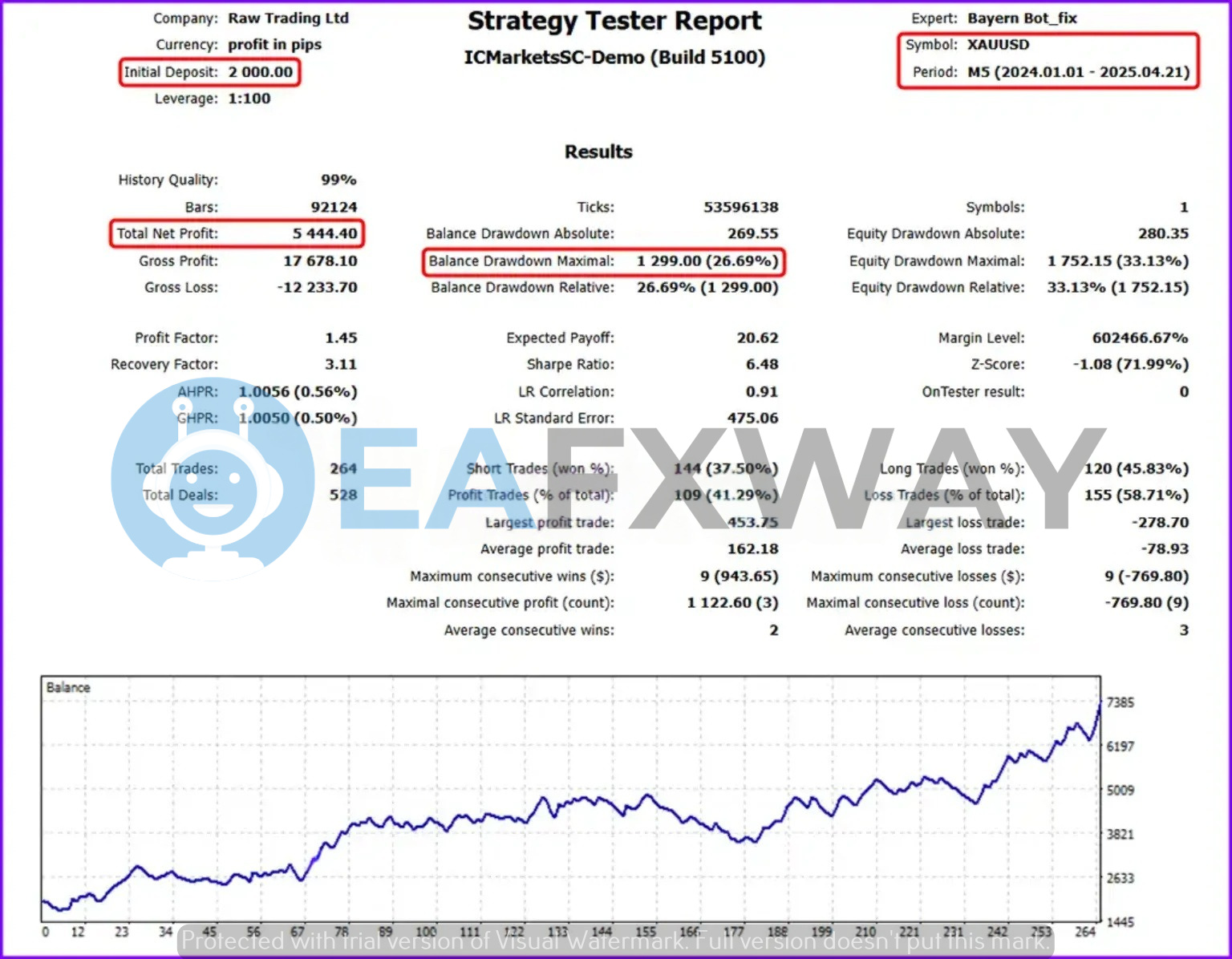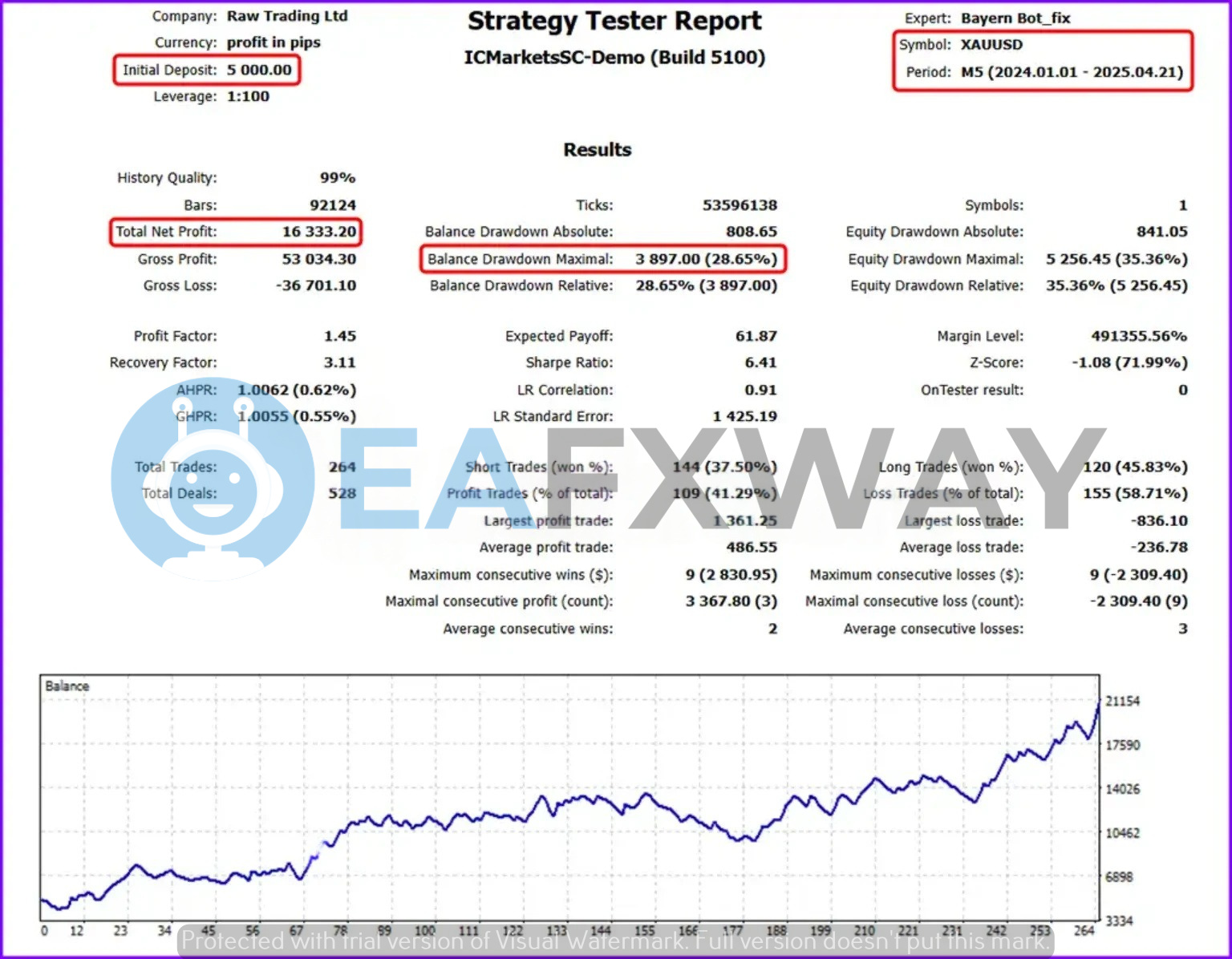 A 99% modeling quality backtest on ICMarkets demo (MT5 Build 5100) covering January 2024 through April 2025 on XAUUSD M5 shows 264 trades, $16,333 net profit from $5,000 starting capital, profit factor 1.45, and Sharpe ratio 6.41.
