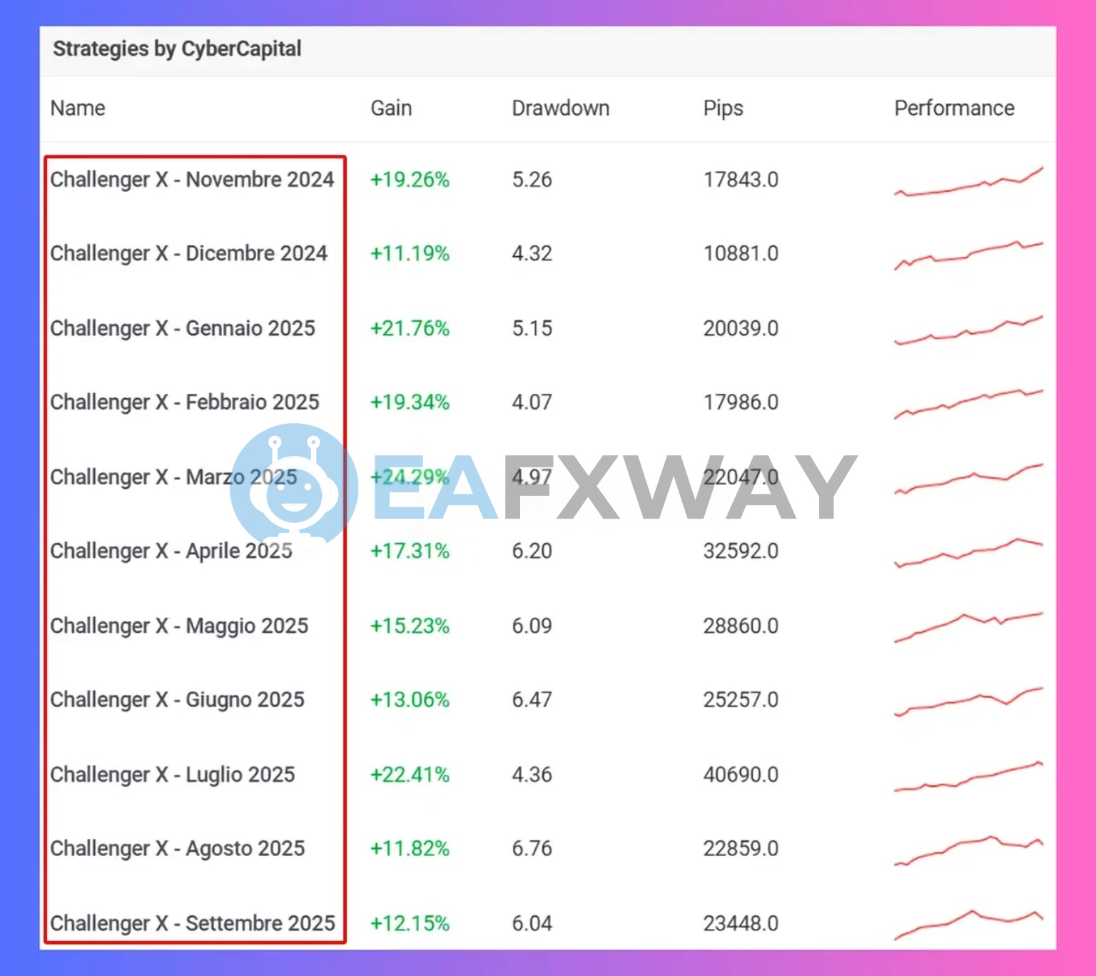 Monthly Myfxbook strategy data covering November 2024 through September 2025 shows 11 consecutive profitable months: gains ranged from 11.19% (December 2024) to 24.29% (March 2025), with drawdown ranging from 4.07% (February 2025) to 6.76% (August 2025) and an average monthly gain of 17.12%.
