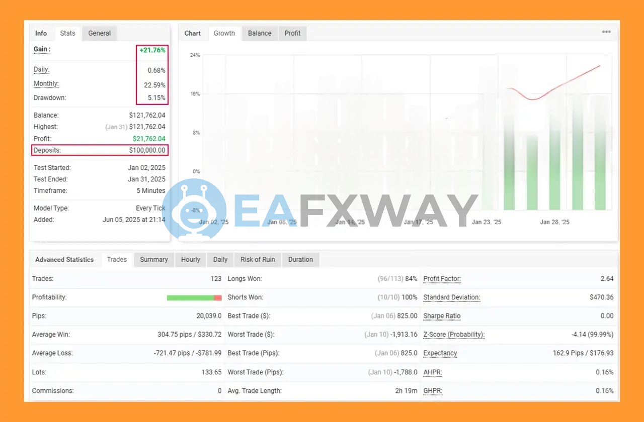The January 2025 M5 backtest on $100,000 starting capital returned 21.76% in 30 days with a 5.15% peak drawdown, 123 trades, and a profit factor of 2.64 — run on Every Tick modeling, which is the highest available quality in MT4’s Strategy Tester.