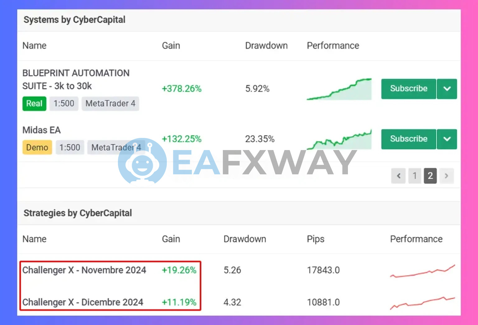 Performance verified with: 1:500 leverage, MetaTrader 4, ECN-condition accounts as reflected in Myfxbook CyberCapital strategy tracking and January 2025 Every Tick backtest.
