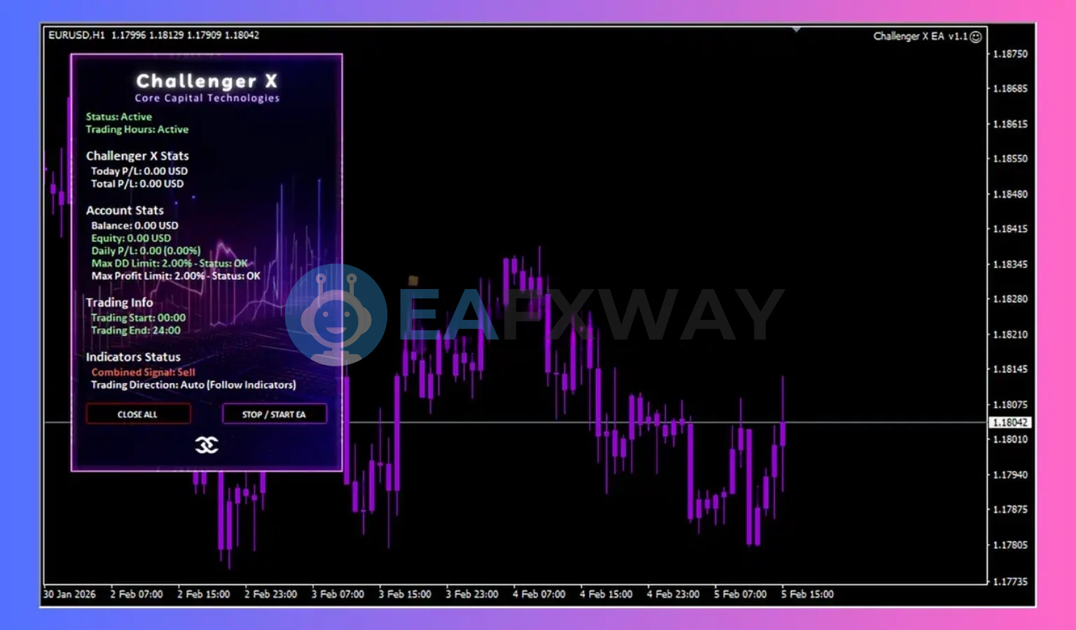 Mechanism: Challenger X runs two operationally distinct modes selected by preset. The XAUUSD M5 mode exploits short-term mean-reversion micro-moves in Gold using an ATR-based grid — grid spacing adapts to current volatility so positions are not placed at fixed-pip intervals during high-volatility sessions. The EURUSD H1 mode targets directional breakouts on the one-hour chart using a combined multi-indicator signal, and is sized for prop-firm daily risk rules rather than maximum return.
