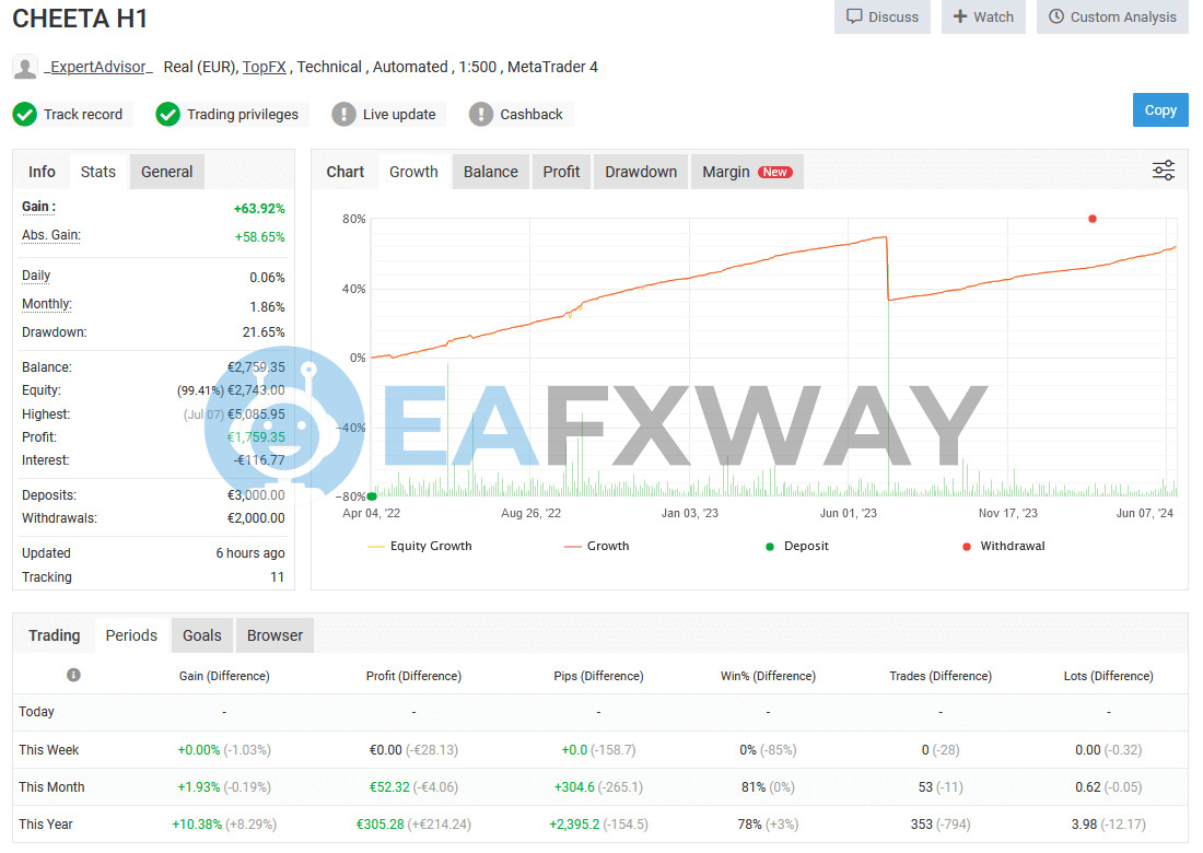 The live verified signal runs on a real EUR account at TopFX under the name CHEETA H1 — full statement available on Myfxbook.