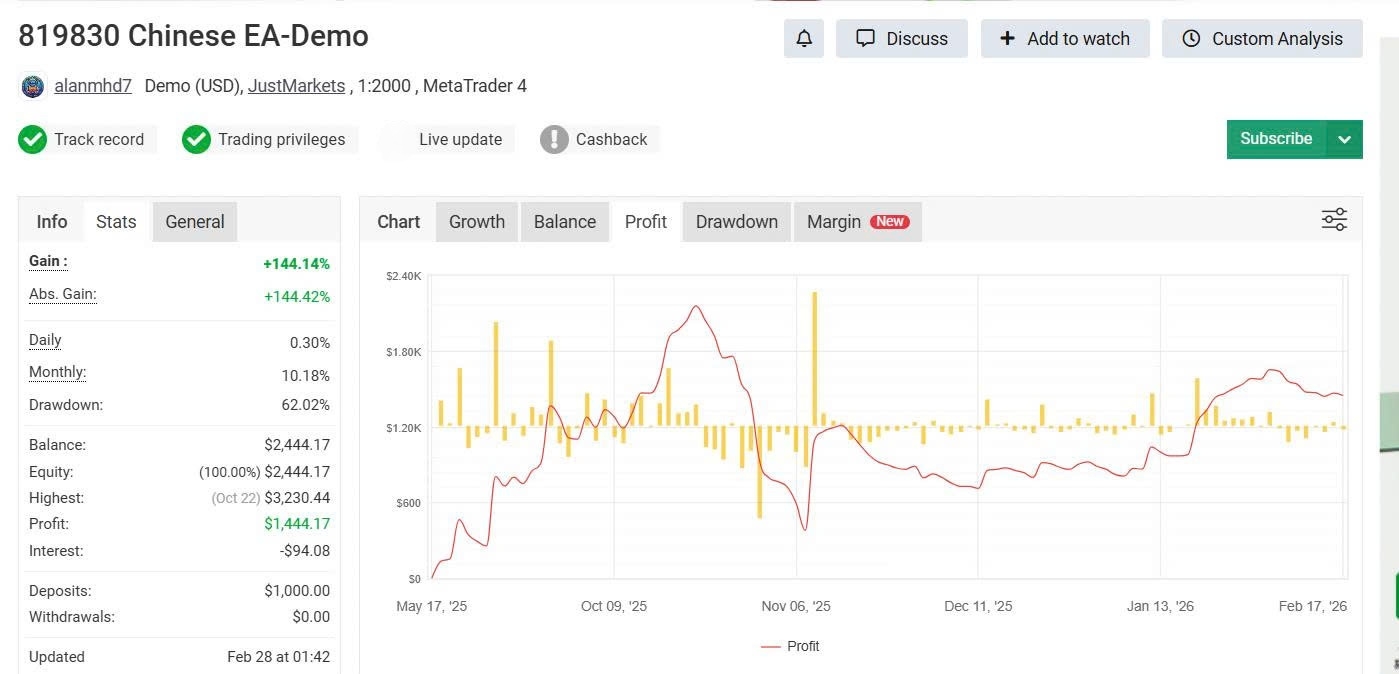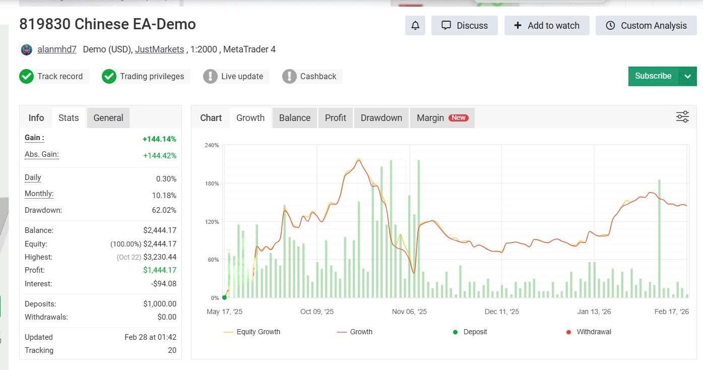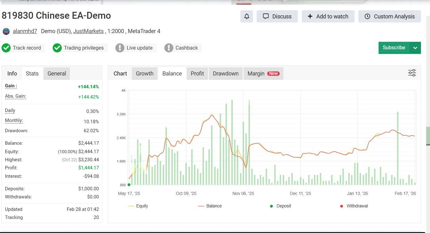Chinees EA MT4 is a demo-tracked automated forex trading system running on MetaTrader 4, with 9 months of continuous MyFxBook monitoring (May 2025–Feb 2026) on a JustMarkets account. MyFxBook tracking #20 records +144.14% gain from a $1,000 deposit at 1:2000 leverage. This is a demo account result — live performance will differ.