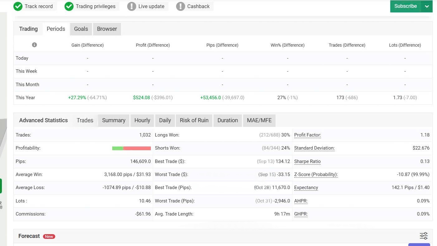 - Mechanism: Automated multi-trade system targeting forex pairs on MT4; average trade length 9h 17m suggests intraday to short-swing holding.