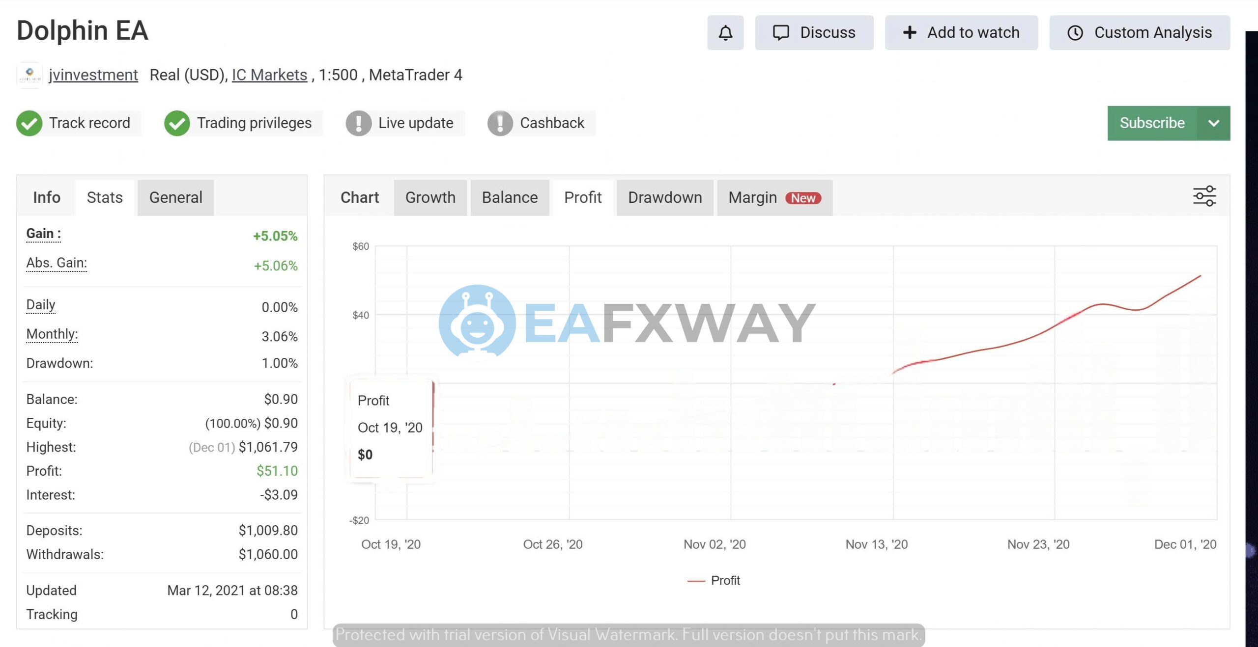 The verified real account at IC Markets (1:500 leverage) returned 5.05% total gain over an active window from October 2020 to December 2020, with a 2.18 profit factor, 73.1% win rate, and a 1.00% peak drawdown across 234 trades. Monthly average return documented at 3.06%.