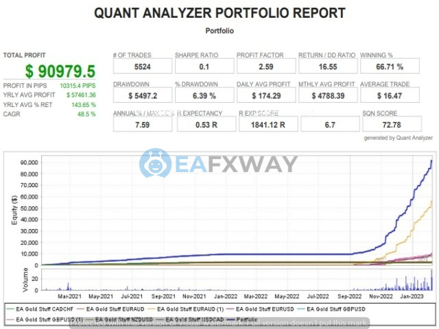 The core risk is structural. EA Gold Stuff opens series orders — multiple positions stacked in the same direction — with an optional lot multiplier. On XAUUSD, a fast spike against an open series compounds floating loss on every added position simultaneously. The DD Reduction Algorithm partially addresses this by closing the most profitable open order against the deepest losing one, reducing net series exposure. This is a partial mitigation — it reduces individual series depth but does not cap total margin usage if multiple series run in parallel. Third-party Myfxbook accounts running this EA under high leverage and aggressive sizing show drawdowns exceeding 99%. The portfolio report above — running conservative sizing across forex pairs — shows 6.39% peak DD over 22 months; that configuration represents the lower-risk end of this EA’s operating range. Running high leverage, large multipliers, or undersized accounts on XAUUSD replicates the blow-up scenario, not the portfolio report scenario.