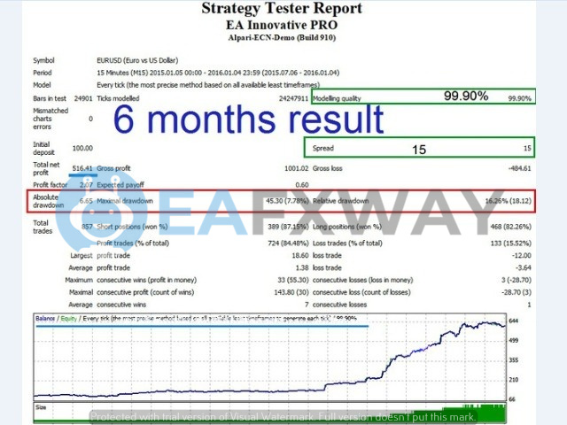 6-month backtest (Jul 2015 – Jan 2016), $100 starting capital: 887 total trades, 37.20% win rate, 3.27 profit factor, 516.43 net profit, 7.79% peak drawdown.