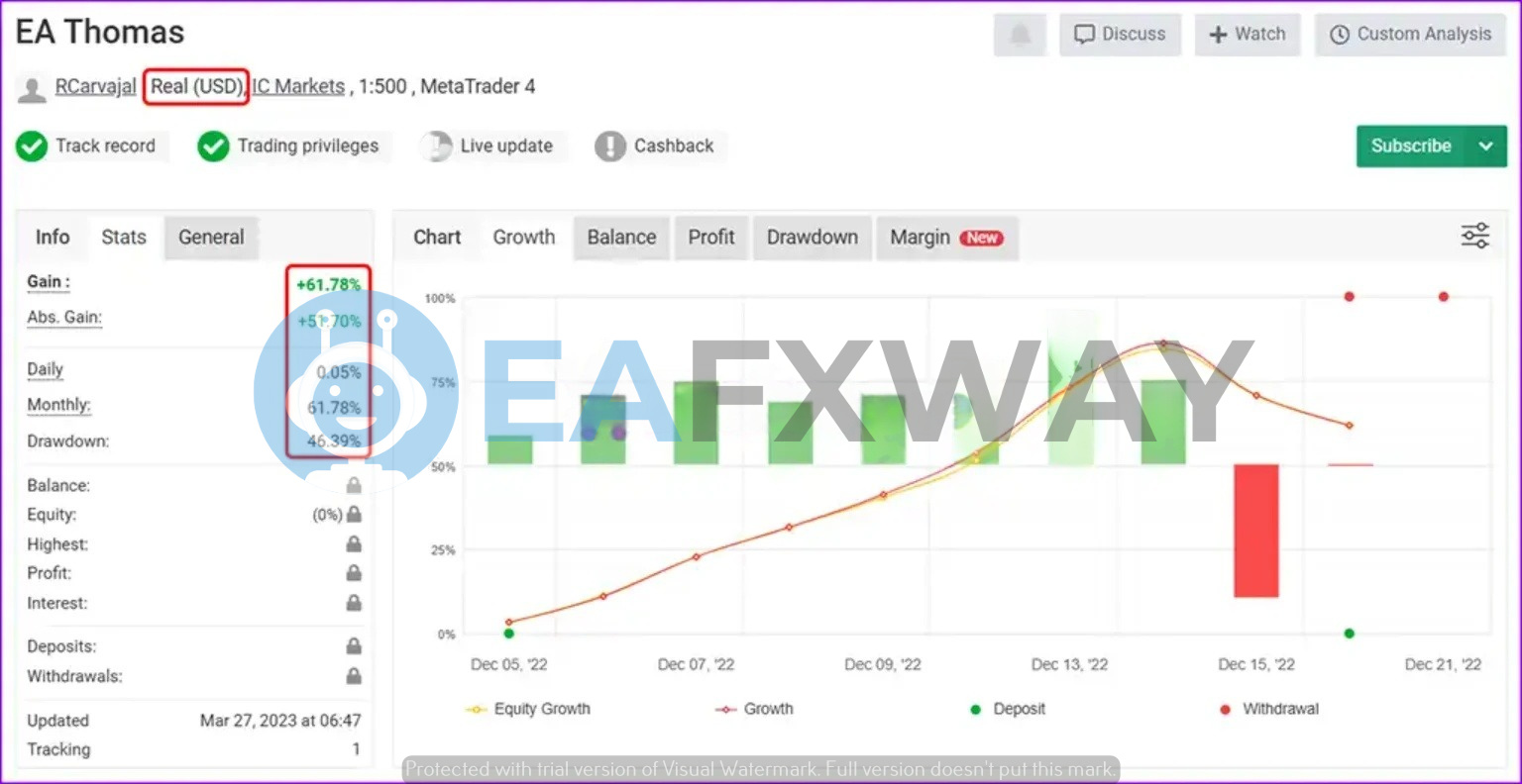 A verified live account on IC Markets at 1:500 leverage recorded +61.78% gain with 46.39% peak drawdown over a 16-day tracked period in December 2022.