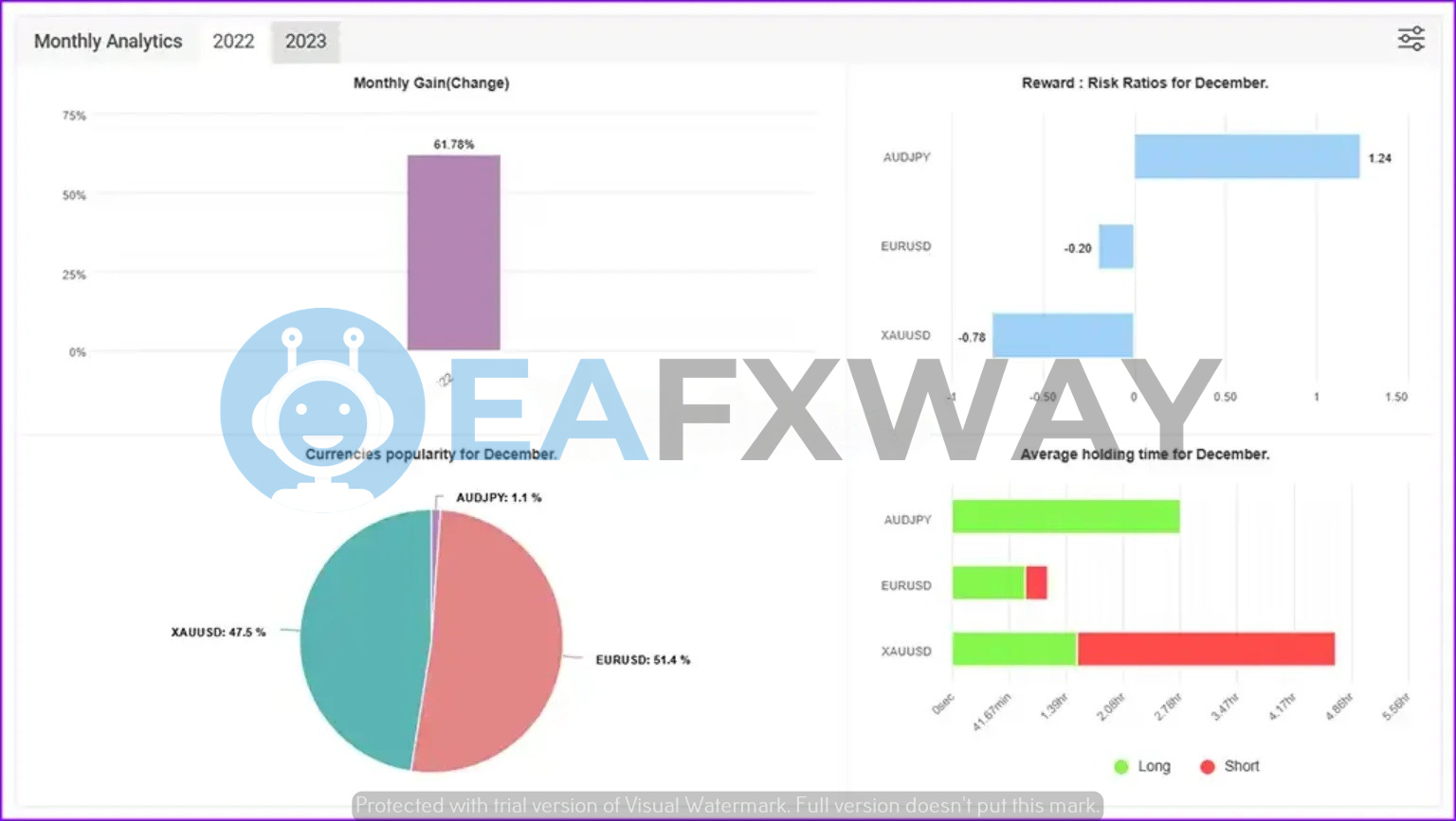Signal Trigger: Specific entry conditions are not publicly documented. December 2023 analytics show EURUSD reward:risk of -0.20 and XAUUSD reward:risk of -0.76, indicating the EA tolerates negative reward:risk ratios in exchange for high win rate — a structure typical of systems that cut losers late rather than early.