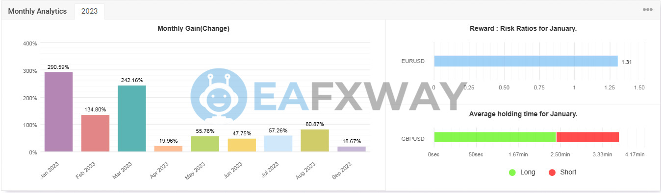 Monthly breakdown confirms consistency across varying market conditions: January 290.59%, February 134.80%, March 242.16%, April 19.96%, May 55.76%, June 47.75%, July 57.26%, August 80.67%, September 18.67% — the weakest month (April) still returned nearly 20%.