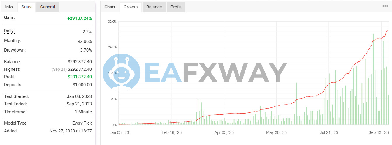 An 8.5-month backtest (January 3 – September 21, 2023) on $1,000 starting capital produced $291,372 net profit at 3.70% maximum drawdown, modeled on every-tick data at 1-minute timeframe.