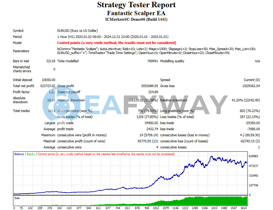 Fantastic Scalper EA is a price-action breakout EA built exclusively for EURUSD H1, using indicator-free level detection with a 50-pip stop-loss and configurable spread filter capped at 30 pips. A 5-year backtest (2020–2024) on the Control Points model establishes a profit factor of 1.21 across 1,612 trades with a 77.85% win rate—figures that require live validation before deployment. Available for immediate MT4 installation with preset configuration included.