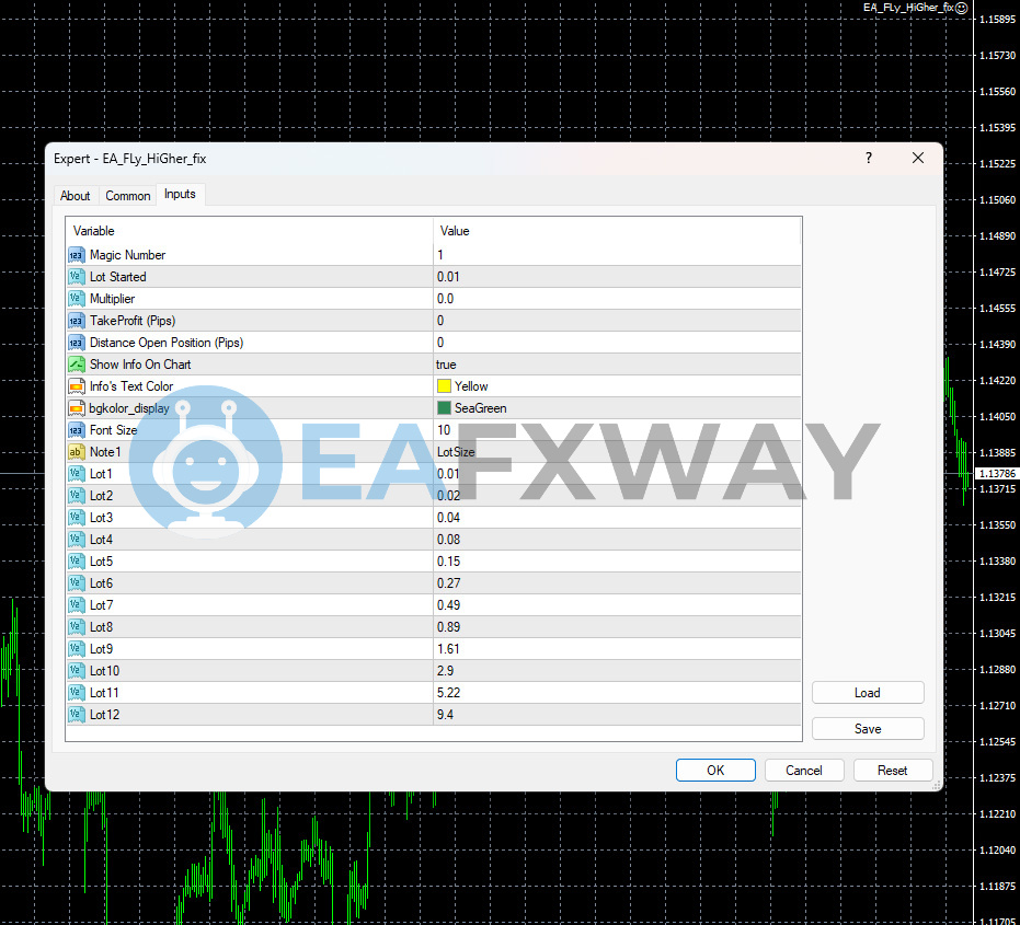 Mechanism: Fly Higher uses a fixed 12-level Martingale grid on a single currency pair via MT4. When an initial trade moves into loss, the EA opens subsequent positions at progressively larger lot sizes — each level in the ladder is preset, not dynamically calculated. The strategy earns when price eventually reverts toward the basket’s break-even level, closing all positions for a net profit. It captures mean-reversion moves but cannot limit losses if price trends directionally through all 12 levels.