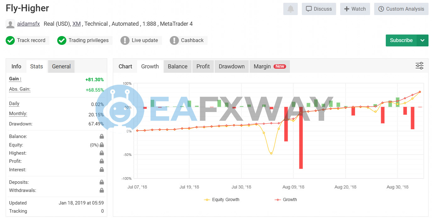 A verified live account on XM recorded 81.30% total gain with a 67.49% peak drawdown over a tracked period ending January 2019.