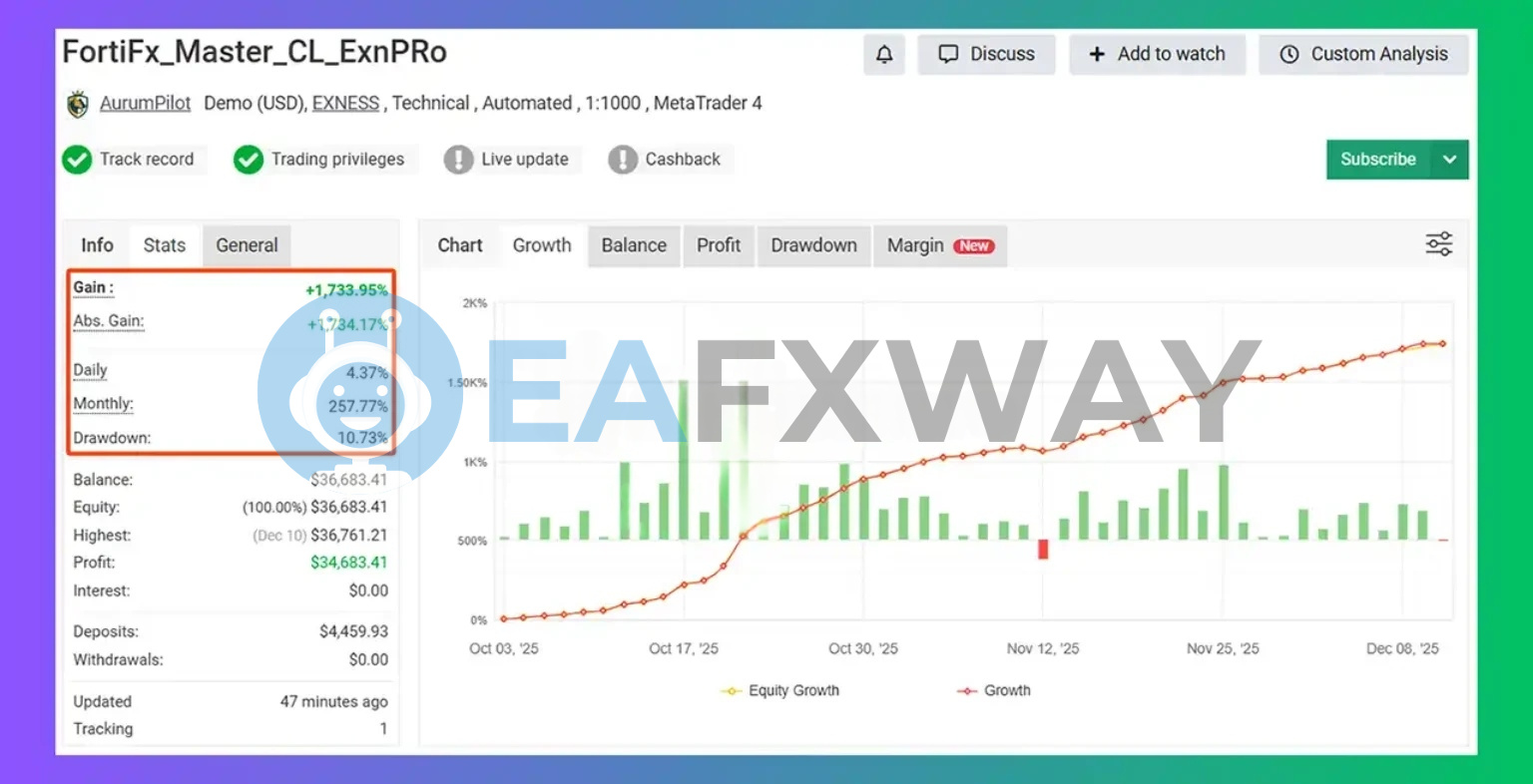 FortiFX_Master_CL_ExnPRO (Demo, MT4, 1:1000): +1,733.95% total gain, 10.73% maximum drawdown, $2,000 starting deposit (deposited $4,459.93 total), tracking Oct 3 – Dec 8, 2025, approximately 2 months. View signals
