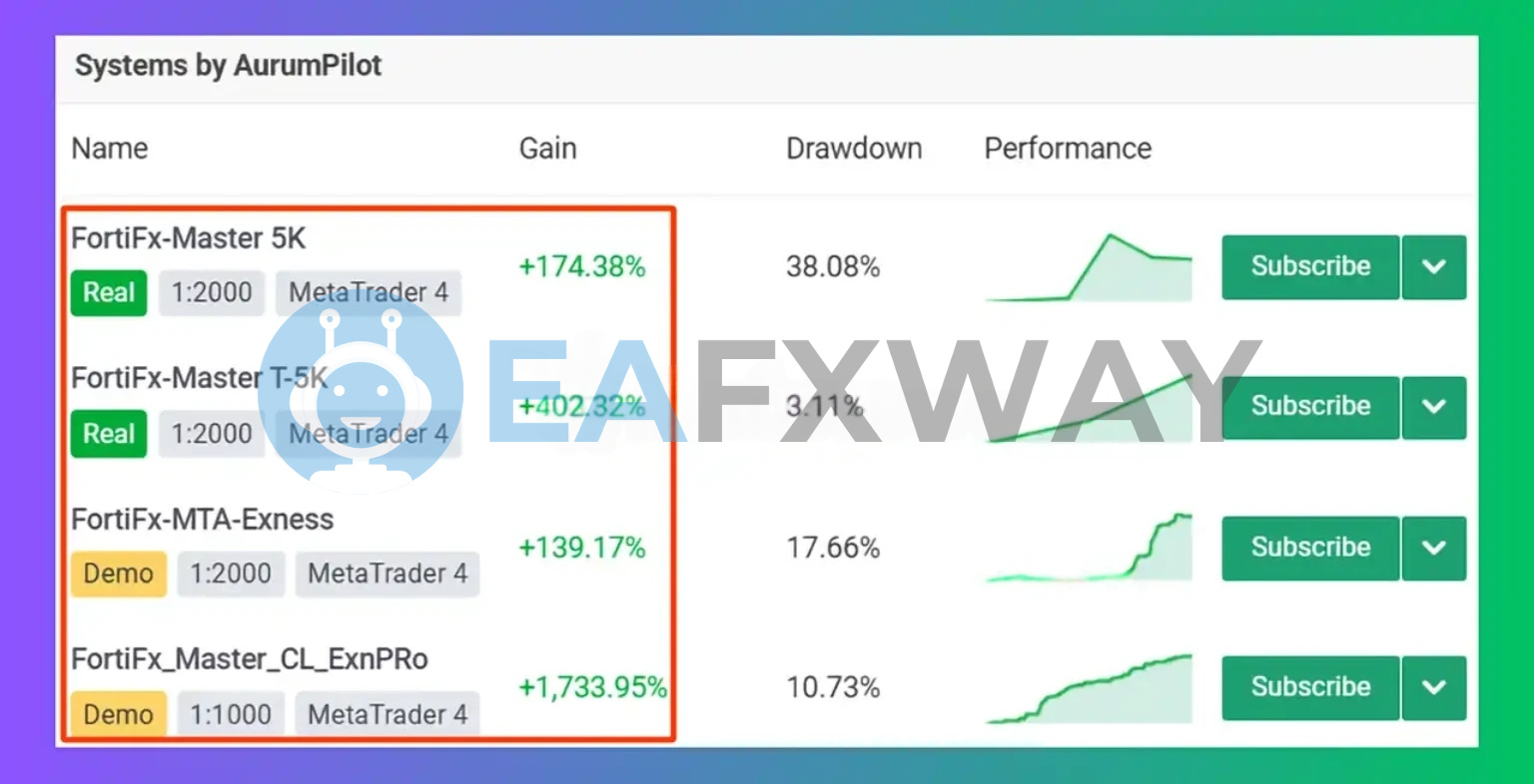 FortiFX Master EA is an automated MetaTrader 4 grid system developed by AurumPilot that trades forex pairs using technical entry triggers across multiple account configurations.
