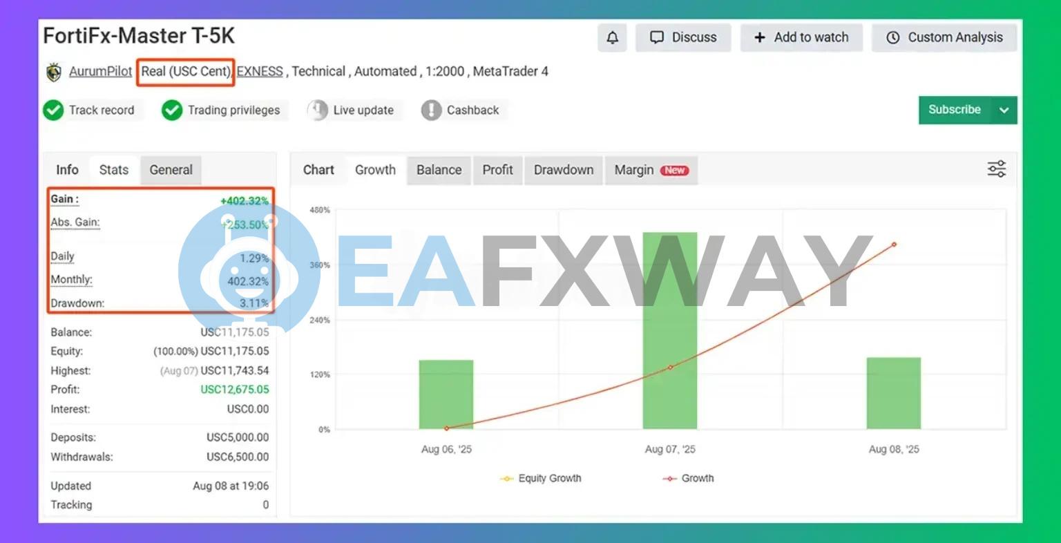 FortiFX-Master T-5K (Real Account, Exness MT4): +402.32% total gain, 3.11% maximum drawdown, USC5,000 starting deposit, USC6,500 withdrawn, tracking period Aug 6–8, 2025.