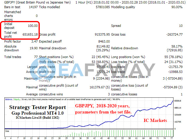 Performance verified with: MT4 strategy tester, GBPJPY H1, IC Markets data feed, 90% modeling quality, $100 starting capital, 2018–2020.