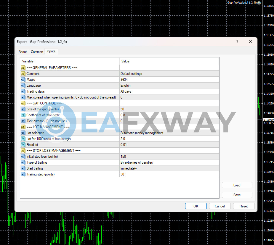 Position Close: Trailing stop tracks candle extremes, activating immediately from position open. Take profit is set at 0.8× the gap size (coefficient 0.8), capturing a partial gap fill rather than requiring full closure. This combination means the EA locks partial gains as price moves toward closure and exits short of the full gap distance.