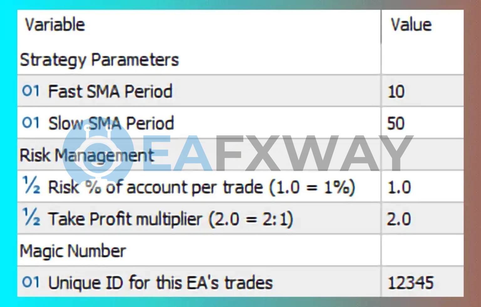 Signal Trigger: A long position opens when the 10 SMA crosses above the 50 SMA. The EA trades only long — no short positions are taken at any point.