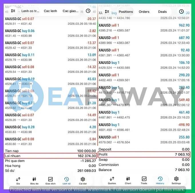 A March 2026 live session on a $100,000 account closed 13 trades on XAUUSD across March 24–26, with individual trades ranging from $962.90 profit to $31.28 loss; zero commission and zero swap were recorded across that session.