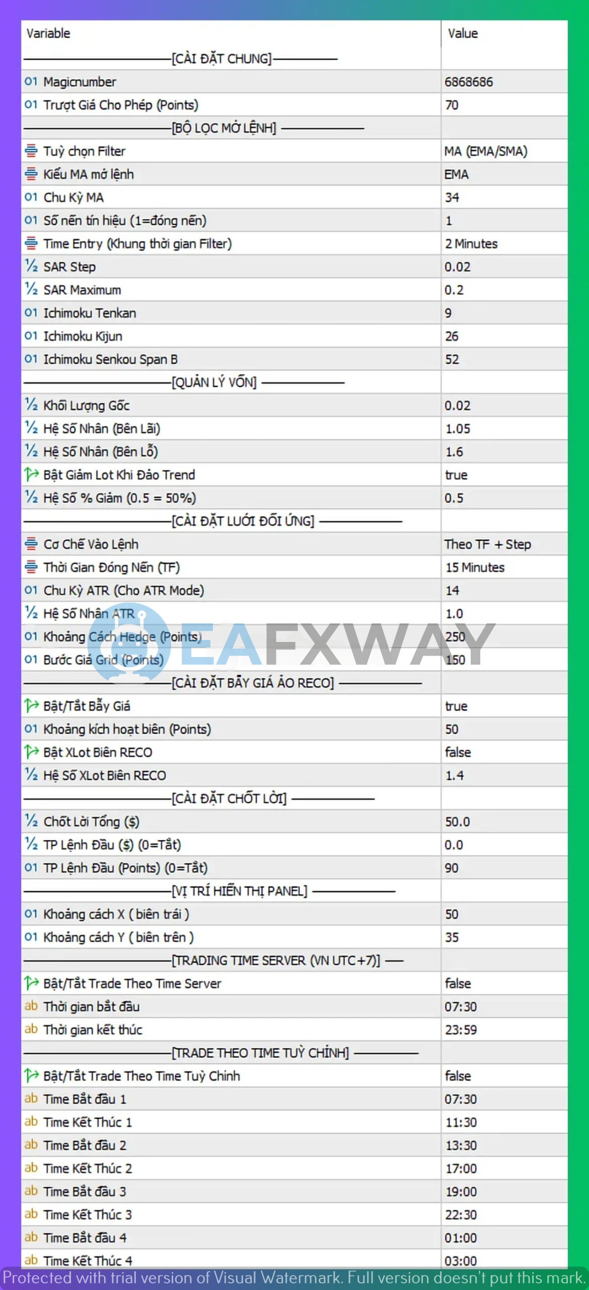 Position Close: Individual positions close at defined take-profit levels per grid layer; the basket’s hard stop is $50 total loss — whichever triggers first closes the open set. Trend-change stop loss (enabled) closes positions if EMA/SAR signal reverses, set at 50% account equity threshold.