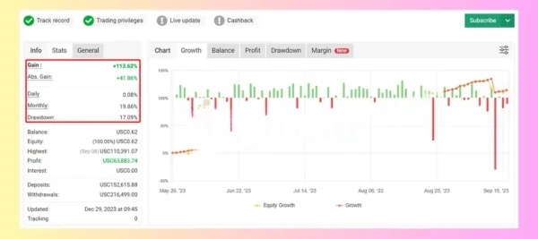 Drawdown figures are developer-stated and cannot be independently verified. Actual DD may exceed claimed figures significantly. The August 2023 equity curve screenshot shows a visible sharp drawdown event — control by capping active pairs to XAUUSD only, setting an equity stop at 15–20%, and deploying Conservative preset on accounts below $1,000. Conservative setup on demo typically reveals true DD range within 60–90 days before any live capital commitment.