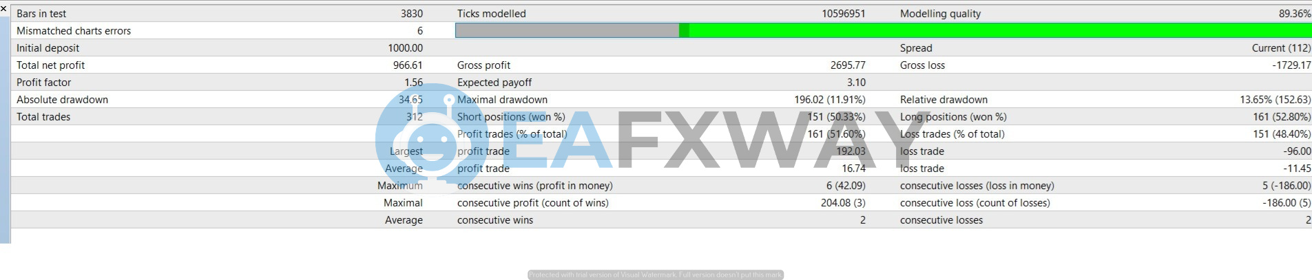 Modelling quality is 89.36% — below the 99% threshold that replicates real tick data. This means spread behavior and slippage during fast moves are approximated, not exact. Results at higher spread brokers or during news events will differ from these figures.