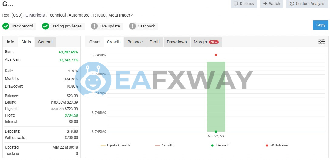 The live IC Markets signal delivers +3,747.69% total gain with a 2.76% daily return and 10.80% maximum drawdown, confirmed through MyFxBook verified tracking. Withdrawals of $700 from an $18.80 deposit demonstrate real profitability beyond paper numbers.
