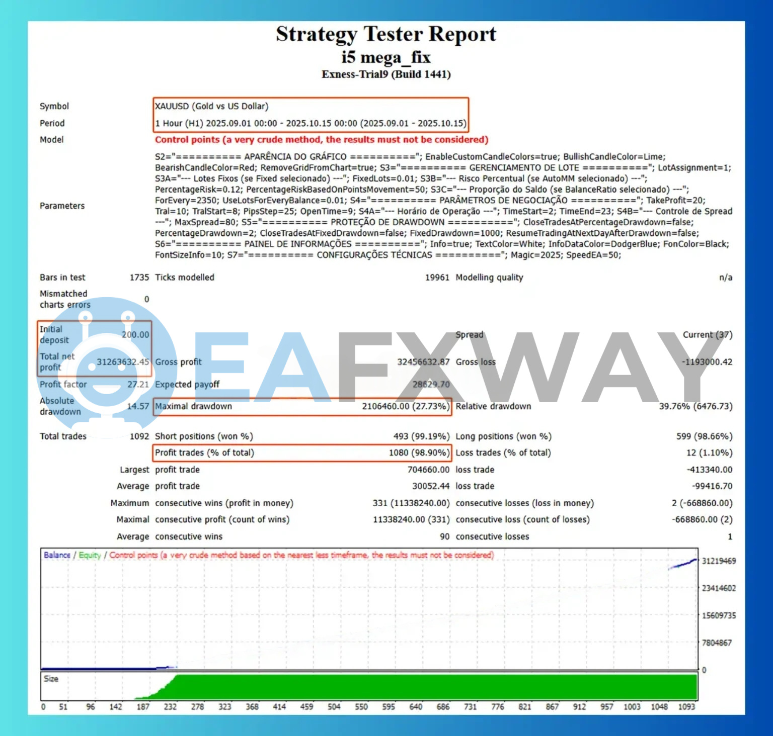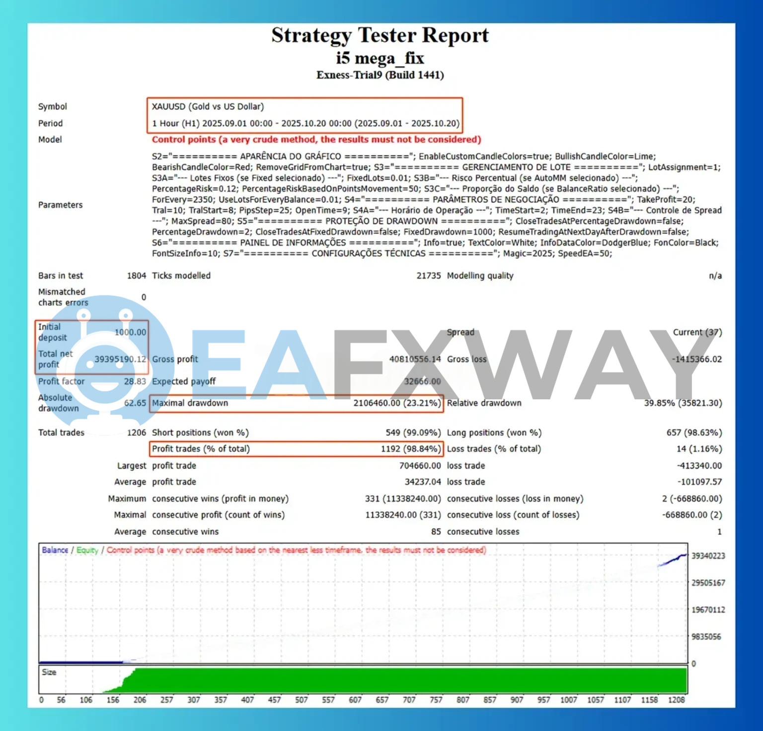 A 50-day backtest (September 1 – October 20, 2025) on $1,000 initial deposit using XAUUSD H1 data recorded 1,206 total trades, 98.84% win rate, 28.83 profit factor, and 23.21% peak drawdown.
