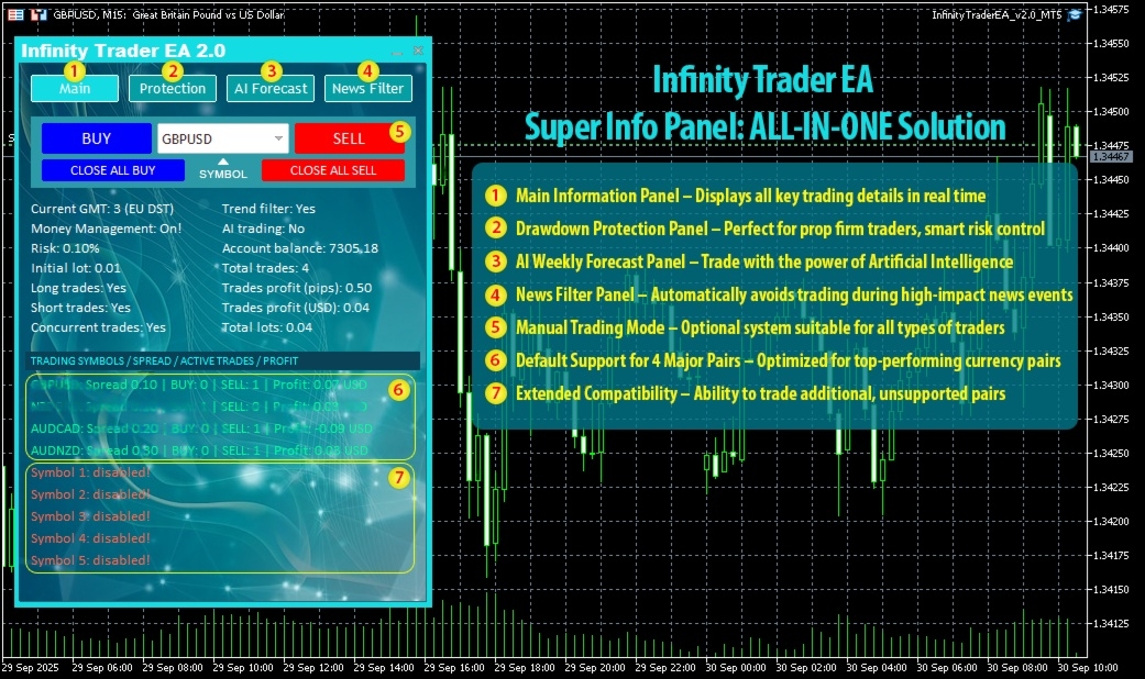 - Exposure Limits: Drawdown Protection Panel enforces equity-level stops; news filter blocks entries during high-impact events.