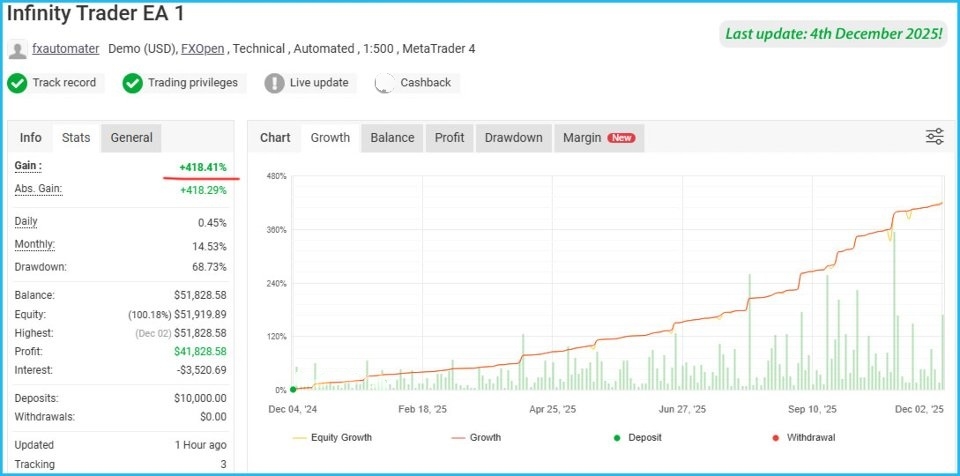 Infinity Trader EA 2.0 is a multi-pair M15 automated system targeting GBPUSD, AUDCAD, and AUDJPY with both live tracking and 99% quality 15-year backtesting across two instruments. Backtest data establishes a profit factor of 4.91 on GBPUSD over 11,376 trades from 2009–2024. A verified live account on FXOpen records +55.45% gain over 11 months with 30.53% peak drawdown.