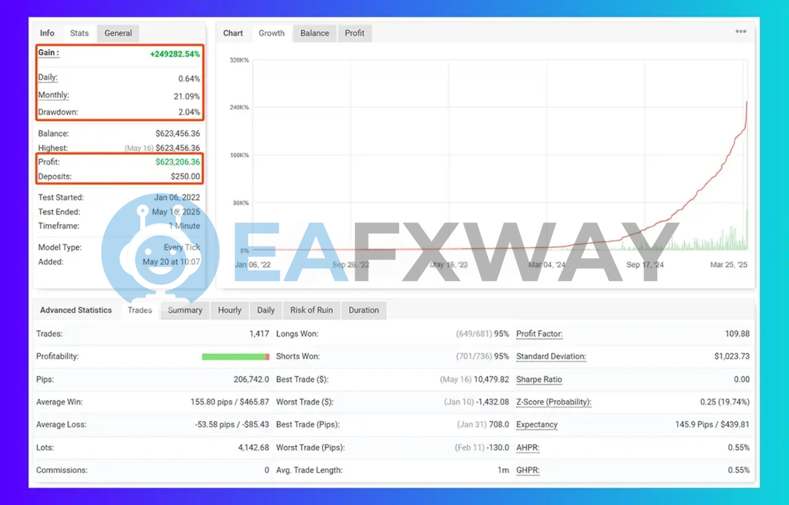 A January 2022 – May 2025 Every Tick backtest on $250 starting capital recorded +249,282.54% total gain, 95% win rate across 1,417 trades, and 2.04% peak drawdown — full breakdown below.