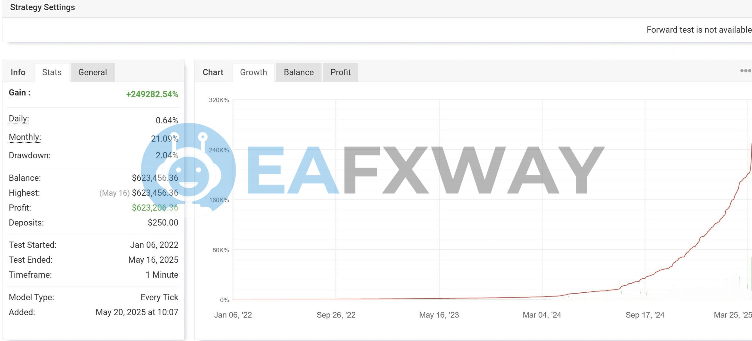 Performance verified with: Every Tick backtest, XAUUSD M1, $250 starting capital, MT4 Strategy Tester, Jan 2022 – May 2025.