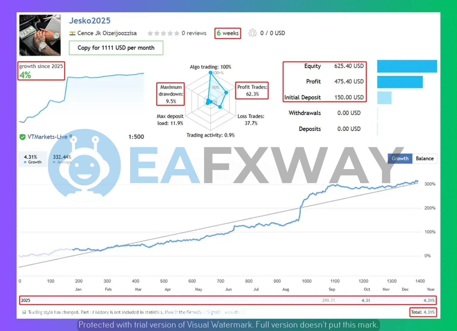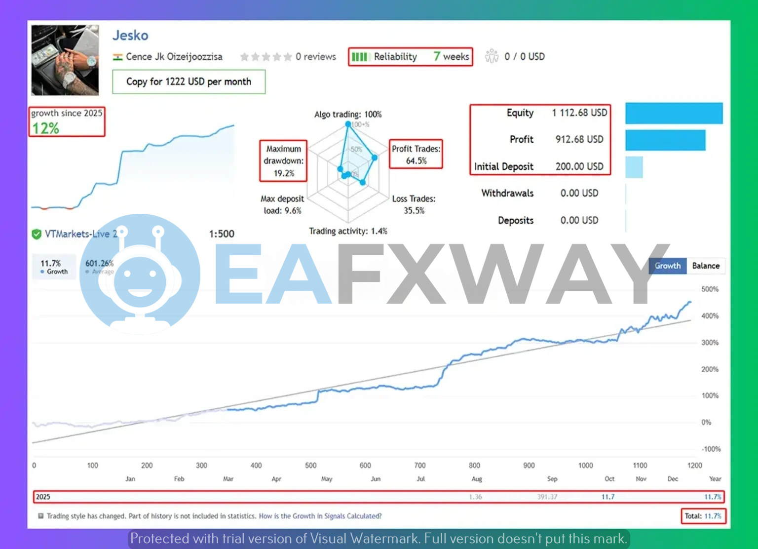 Live VTMarkets accounts record 601.26% growth on the primary account and 316.93% return on a second account started at $150 over 6 weeks. The primary account reached $1,112.68 equity from $200 with a 64.5% win rate. A separate backtest across full-year 2025 maps balance growth from approximately $1,100 to $2,680 on low-risk settings.