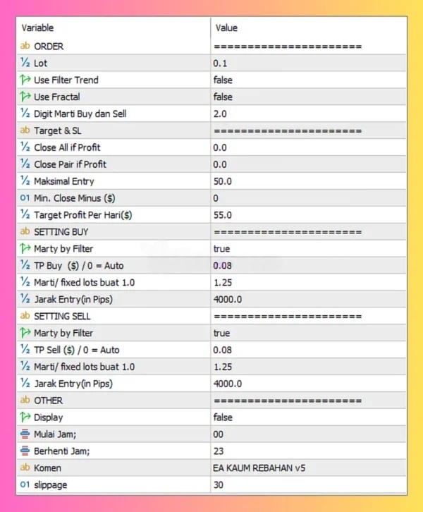 Risk disclosure: Drawdown figures are developer-stated and cannot be independently verified. Actual drawdown may exceed claimed figures significantly. The Martingale multiplier (1.25x) across up to 50 entries creates compounding exposure — a single sustained directional move against open positions can produce rapid equity loss. Control by limiting maximum entries to 10–15 initially, setting a hard equity stop at 20%, and testing exclusively on demo for a minimum of 90 days. Conservative lot sizing (0.01 on $1,000+) with the daily profit target set at $20–$30 typically produces more stable outcomes than vendor-stated maximums.