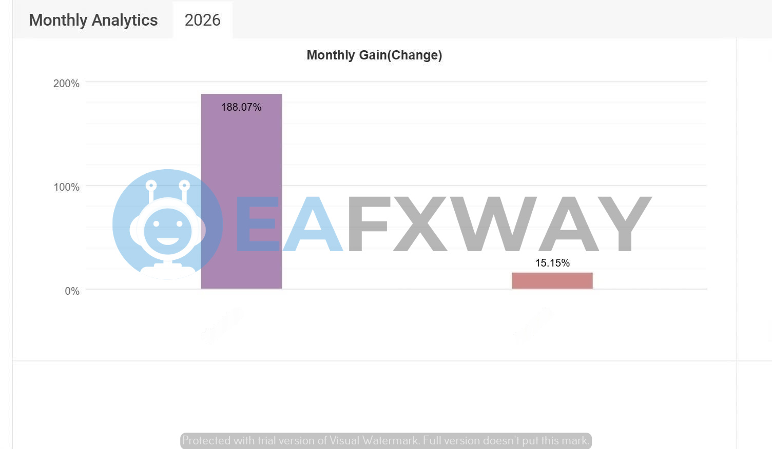 Monthly breakdown: Month 1 recorded 188.07% gain; Month 2 (current, partial) is tracking at +15.15% with 286 trades completed and 100% win rate in the current window.
