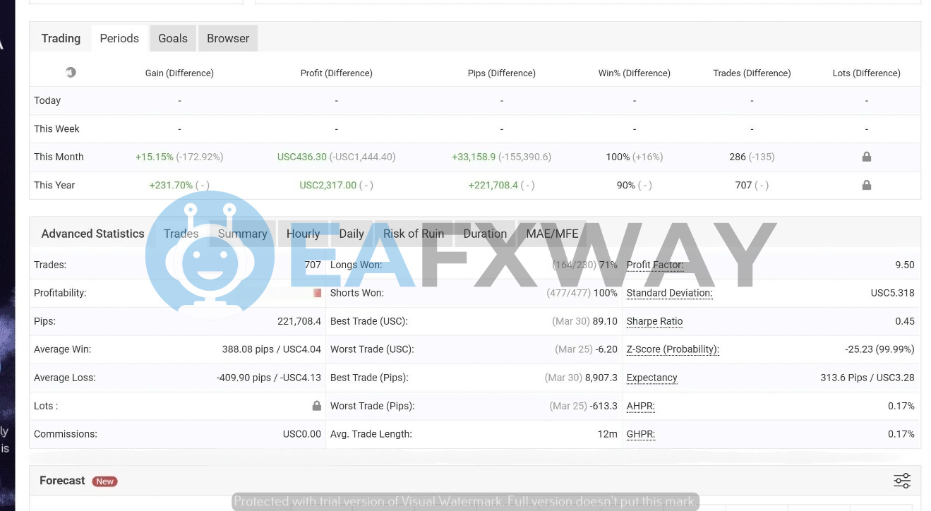 The live account opened March 3, 2026 on USC1,000 capital. Over 16 trading days, it reached +216.33% total gain across 707 trades with a 14.53% peak drawdown. Profit factor across the full period is 9.50, with a 90% annual win rate and average trade duration of 12 minutes.