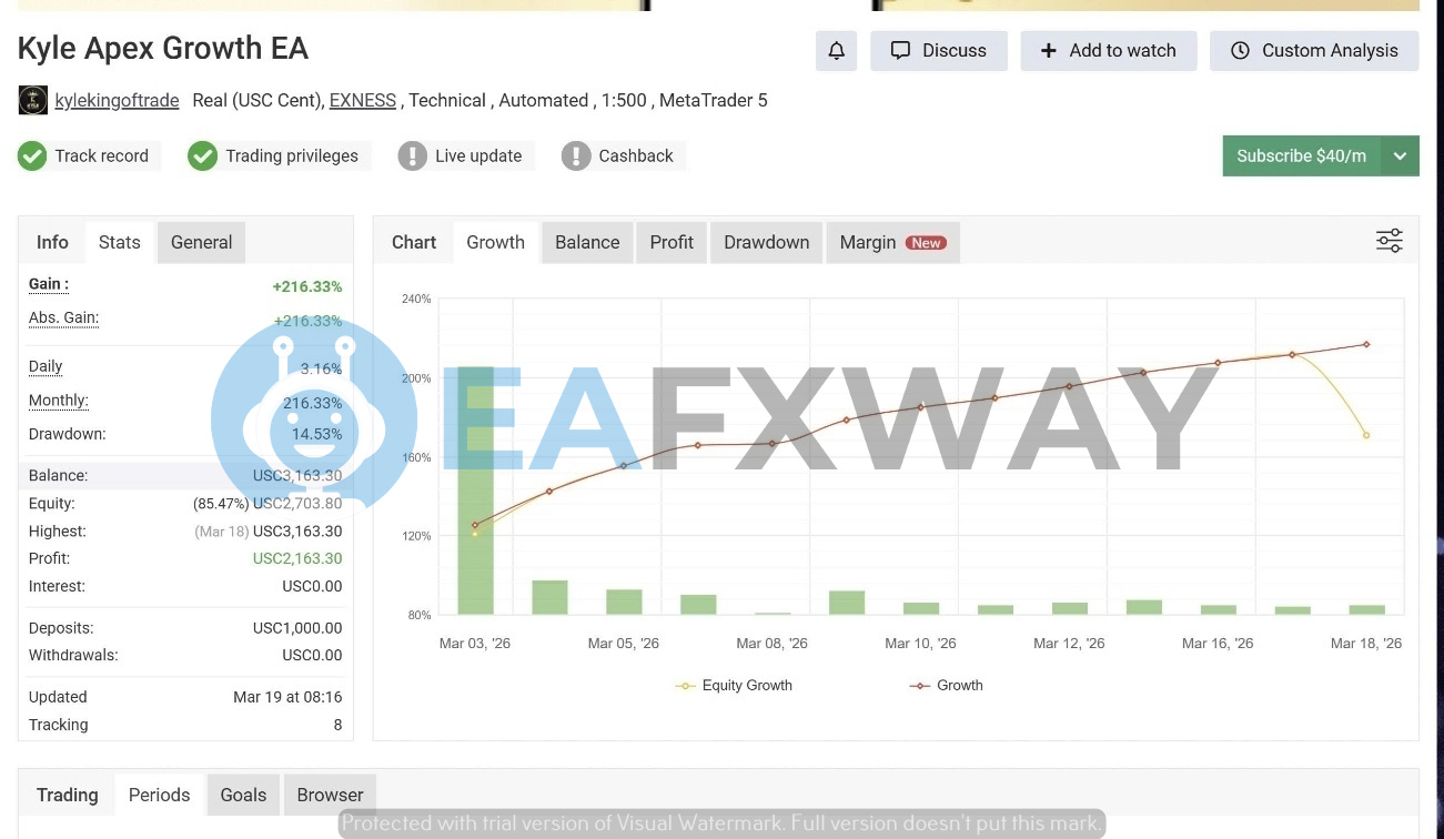 A verified live cent account shows +216.33% total gain from March 3–18, 2026, with 14.53% peak drawdown on a USC1,000 starting deposit.