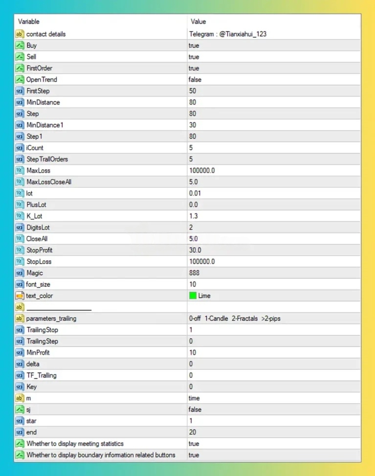 - Signal Trigger: FirstOrder opens initial trade; subsequent grid orders triggered by MinDistance (80 pips) and Step (80 pips) spacing.