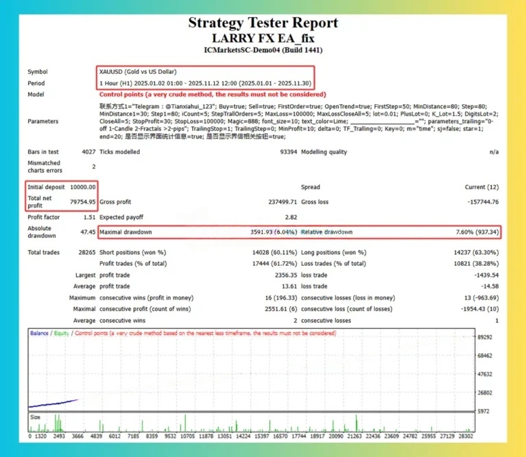 Preliminary backtest on XAUUSD H1 (Jan–Nov 2025) using control-points modeling (93% quality) suggests $79,754 net profit from a $10,000 deposit across 28,265 trades, with a profit factor of 1.51 and a 61.72% win rate. The modeling method is explicitly flagged by MetaTrader as a crude approximation — results must be treated as directional only.