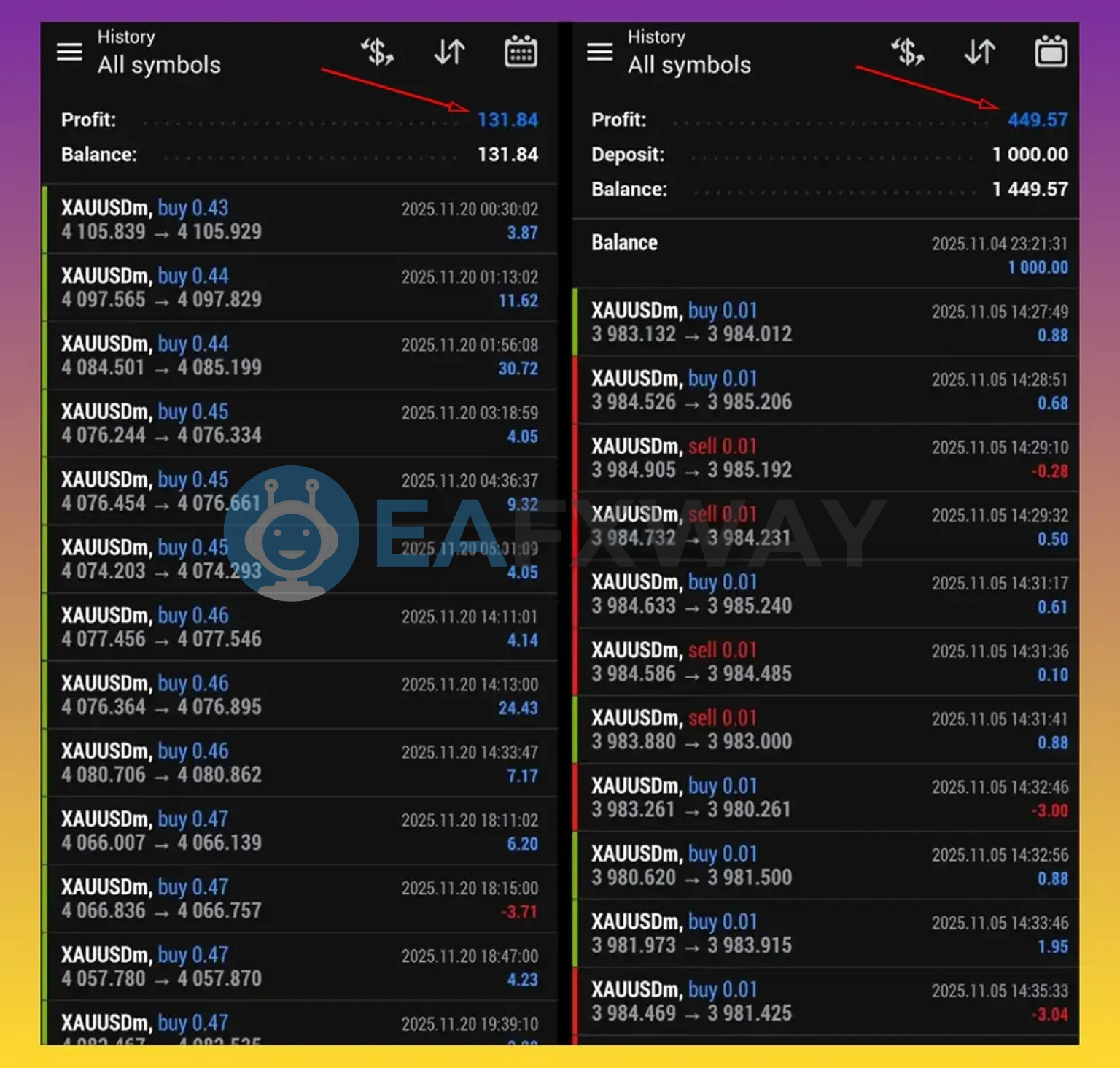 A separate account statement shows $1,000 initial deposit growing to $1,449.57 balance, with a November 20, 2025 trading session recording 13 visible buy trades at lot sizes 0.43–0.47 on XAUUSD, total session profit $131.84.