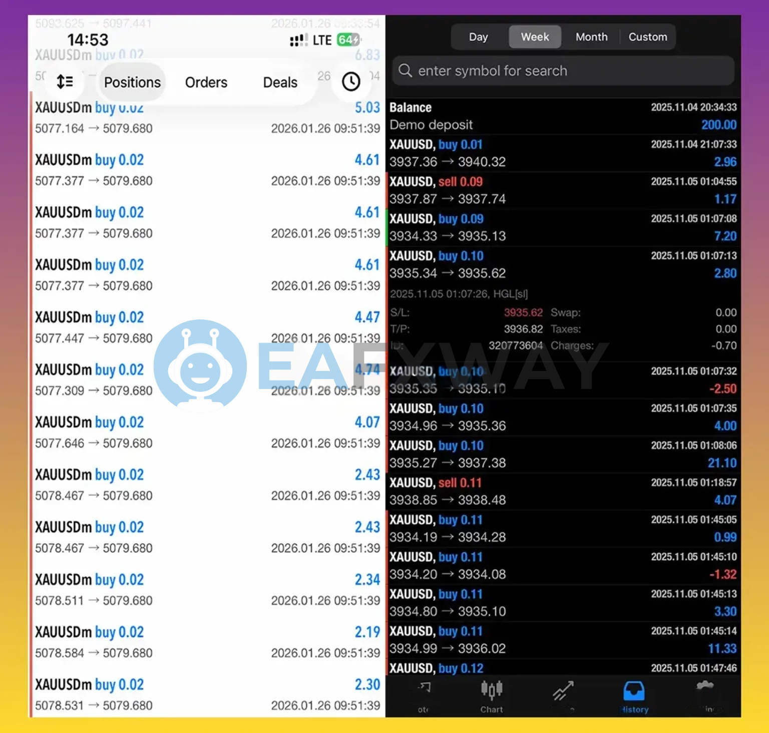 A two-day demo statement on $200 capital covers November 4–5, 2025: 16+ trades on XAUUSD, mix of buy and sell positions, lot sizes from 0.01 to 0.11, with individual trade profits ranging from -$2.50 to +$21.10.