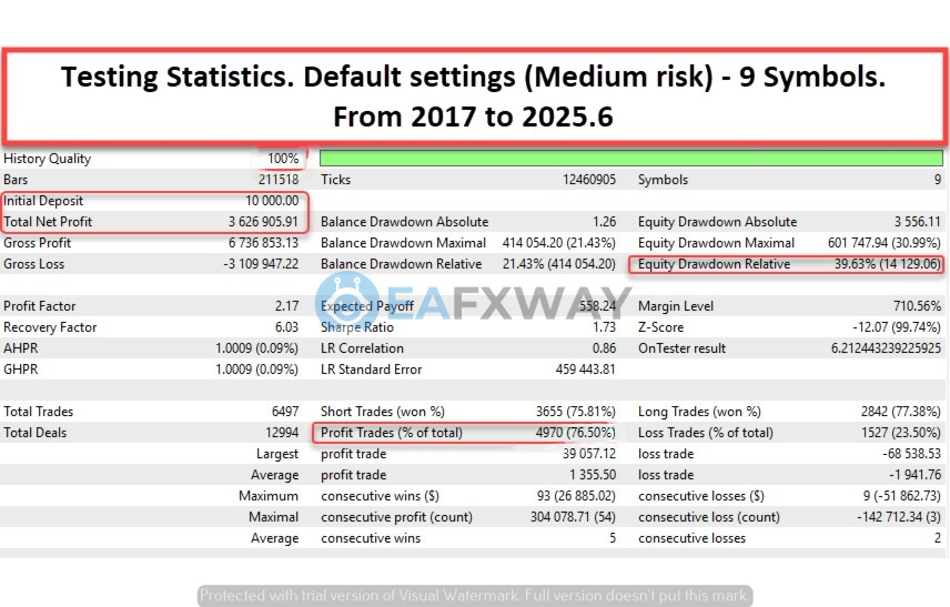 The 2017–2025 backtest (100% history quality, 9 symbols, $10,000 start) produced a total net profit of $3,626,905 across 6,497 trades. Profit factor reached 2.17; Sharpe ratio 1.73; win rate 76.50%. The 2010–2016 window added further validation: ~140% average annual return, 40% maximum drawdown, on the same 9-pair configuration.