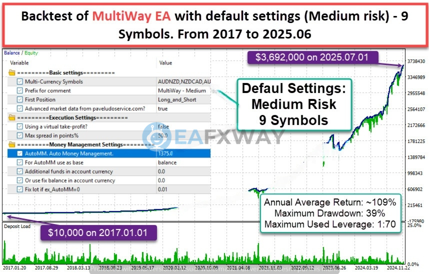 Exposure Limits: AutoMM set to 1.37% of balance at medium risk; maximum leverage used in 2017–2025 backtest reached 1.70x — well below the 1:100 minimum leverage requirement. Safe Exit Mode available.