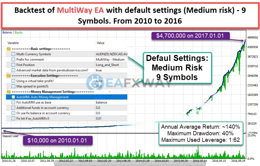 The core risk: MultiWay breaks hardest when multiple pairs enter a sustained one-way trend simultaneously — USD strength or weakness that crosses EURUSD, GBPUSD, USDCAD, and AUDCAD at the same time opens correlated grid positions across four pairs at once, compounding exposure rather than diversifying it. This is a structural weakness — it cannot be removed, only sized for. The live signal shows a peak equity drawdown of 57.54% under real conditions. The controlled-loss exit mechanism prevents endless holding, and the volatility filter blocks new entries during strong trends, but neither eliminates drawdown during coordinated multi-pair moves. At the documented medium-risk AutoMM setting (1.37% of balance), backtest equity DD reached 39.63% — reducing AutoMM to a more conservative level lowers exposure but also reduces return proportionally; exact conservative-preset outcomes are not published and require demo testing to classify.