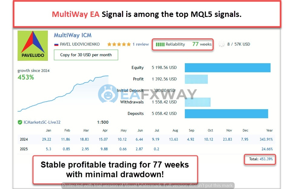 The live signal account grew 371% over 77 weeks from a $300 deposit on ICMarkets real account — that translates to roughly 5–10% per month in favorable conditions, based on the monthly breakdown showing a range from 0.66% (May 2025) to 29.22% (January 2024). Results vary significantly by market regime: months where correlated pairs trend one-way produce lower returns or drawdown; range-bound months produce the bulk of gains. At medium-risk AutoMM (1.37% of balance), backtest average annual return was approximately 109% over 8.5 years — but with equity drawdowns reaching 39.63%. Capital size, broker spread, and AutoMM setting all shift these figures. The realistic expectation: positive long-term compounding with periods of significant floating drawdown, not smooth monthly income.