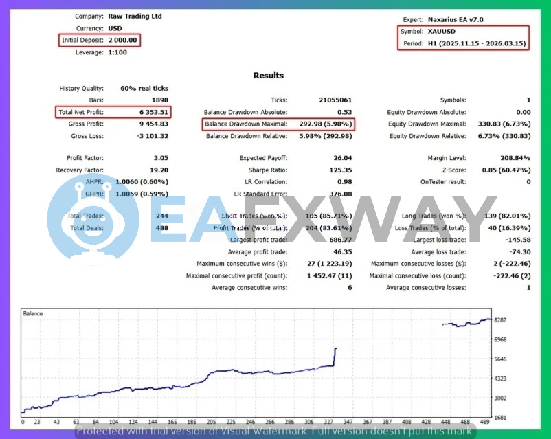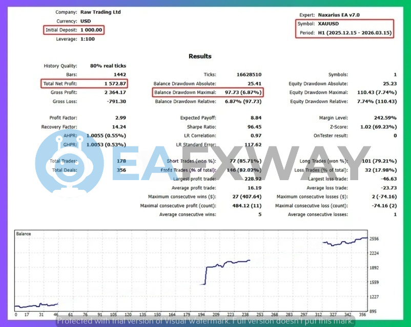 Performance verified with: MT5 backtest, Raw Trading Ltd, 1:100 leverage, $1,000–$2,000 starting capital.